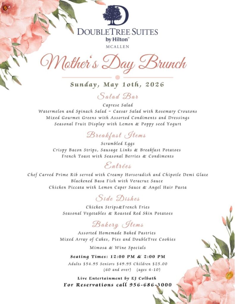Celebrate Mom in style at DoubleTree Suites by Hilton McAllen’s elegant Mother’s Day Brunch on Sunday, May 10th, 2026. Treat her to a delightful dining experience featuring a beautifully curated menu, including a fresh salad bar, classic breakfast favorites, chef-carved prime rib, savory entrées, and an array of decadent bakery desserts.